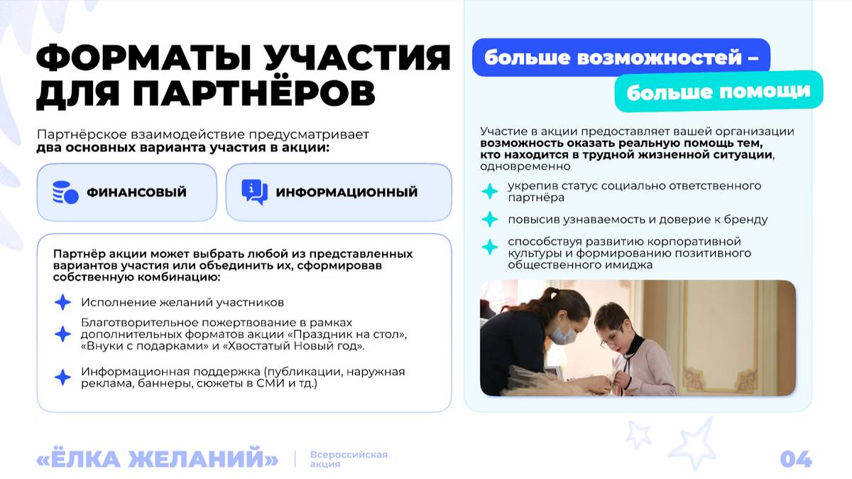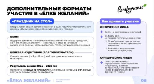 Подробности вариантов участия в «Ёлке желаний», основные этапы акции в 2025/2026 году и категории участников указаны в карточках.