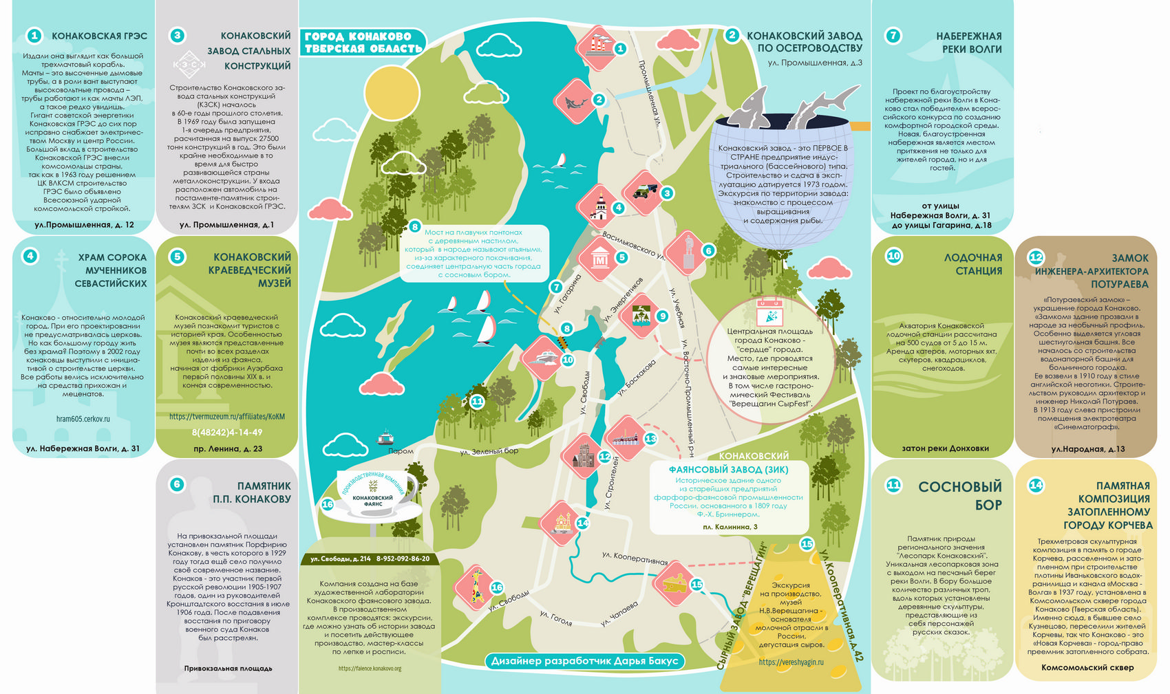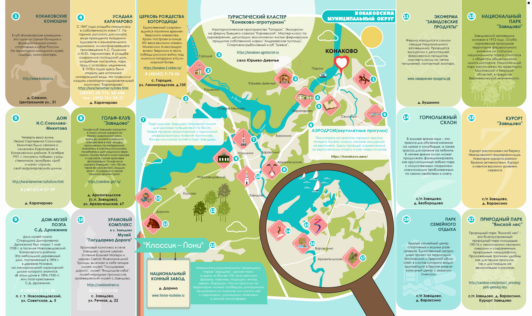 - точки притяжения туристов: ПК «Конаковский Фаянс», парк «Ямской лес», Конаковский краеведческий музей, Конаковский дом пряника семьи Унжаковых, Конаковский завод по осетроводству, музей «Государева дорога», Конаковские конюшни, Эко-ферма «Завидовские продукты», Сырзавод, Национальный конный завод «Классик Пони», дом-музей известного русского поэта С.Д. Дрожжина (пгт. Новозавидовский), дом-музей детского писателя И.С. Соколова-Микитова, усадьба «Карачарово», принадлежащая в свое время художнику и общественному деятелю XIX в. Г.Г. Гагарину, 17 храмов (Церковь Рождества пресвятой Богородицы в с. Городня, Храмовый комплекс села Завидово и др.)
