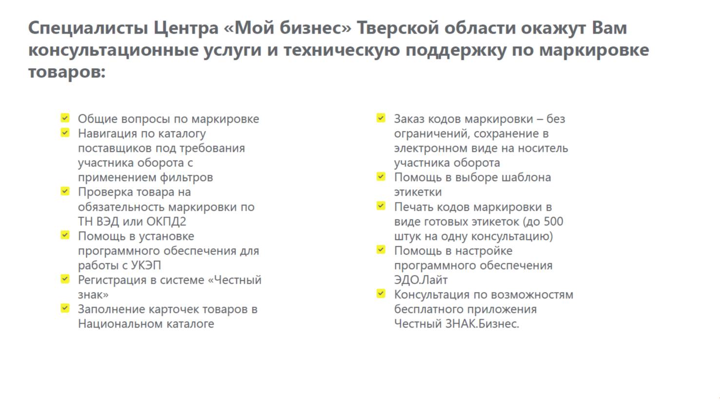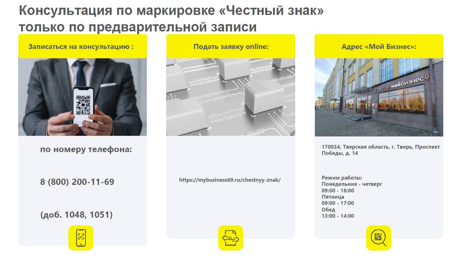 Также можно оставить онлайн-заявку на официальном сайте Центра «Мой бизнес» по ссылке: https://mybusiness69.ru/chestnyy-znak/