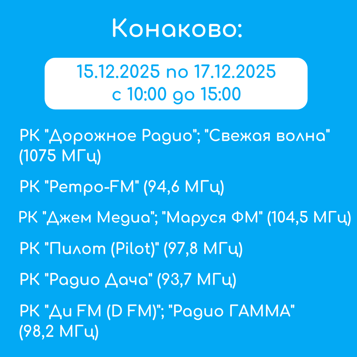 Филиал «Тверской областной радиотелевизионный передающий центр» информирует о том, что в г. Конаково с 15 по 17 декабря 2025 года* ожидаются перерывы в трансляции радиопрограмм в связи с выполнением внеплановых работ на объектах филиала РТРС «Тверской ОРТПЦ» РТС «Конаково».